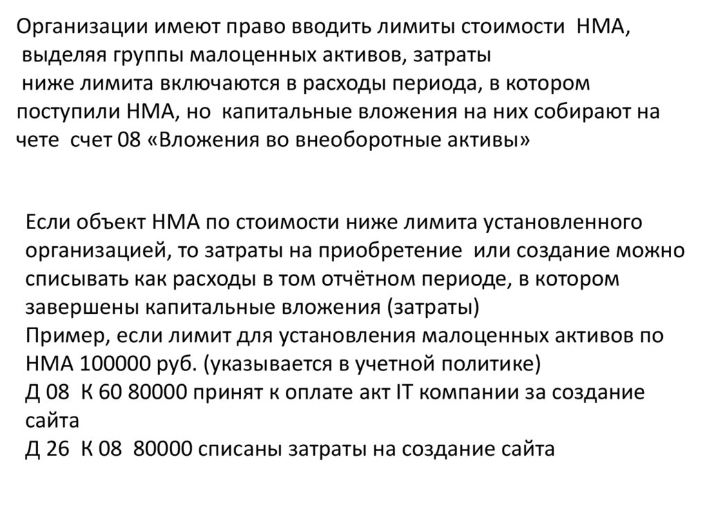 Организации имеют право вводить лимиты стоимости НМА,выделяя группы малоценных активов, затраты