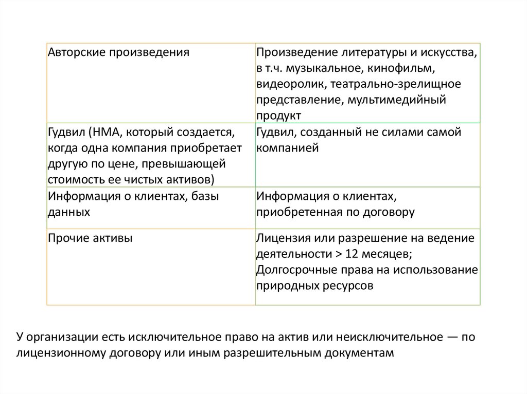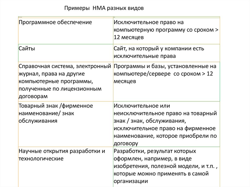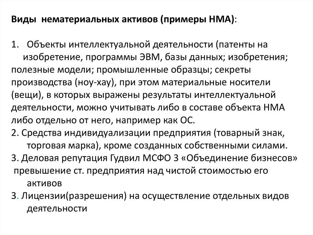 Виды нематериальных активов (примеры НМА):1. Объекты интеллектуальной деятельности (патенты на