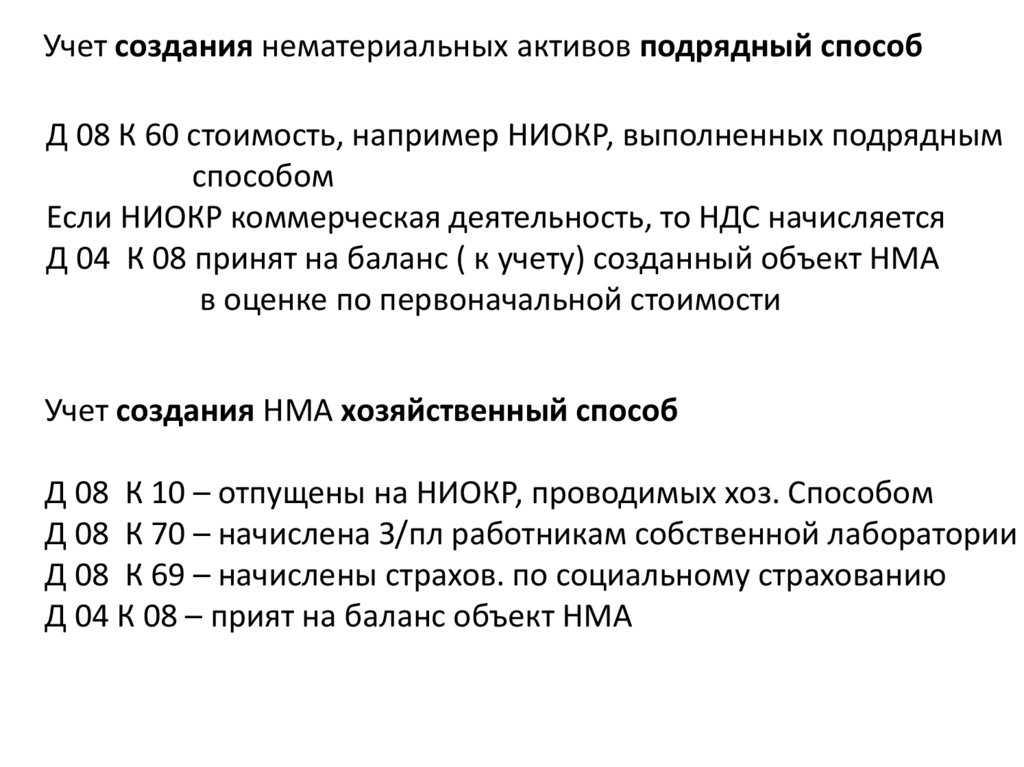 Учет создания нематериальных активов подрядный способД 08 К 60 стоимость, например НИОКР, выполненных подрядным