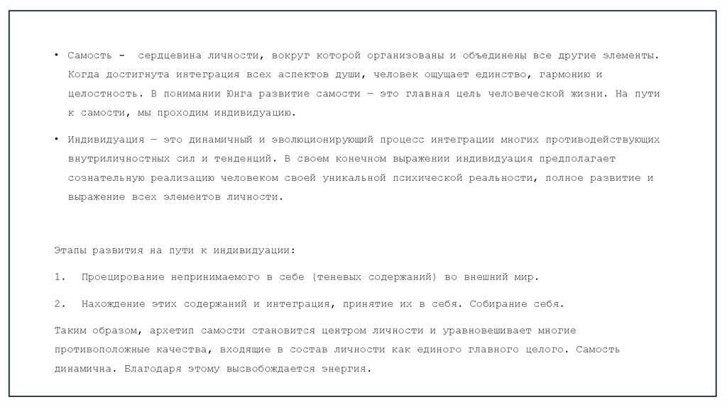 • Индивидуация — это динамичный и эволюционирующий процесс интеграции многих противодействующих