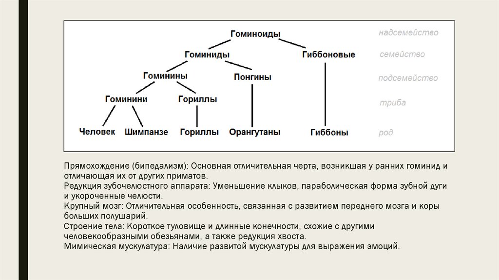 Прямохождение (бипедализм): Основная отличительная черта, возникшая у ранних гоминид иотличающая их от других приматов.