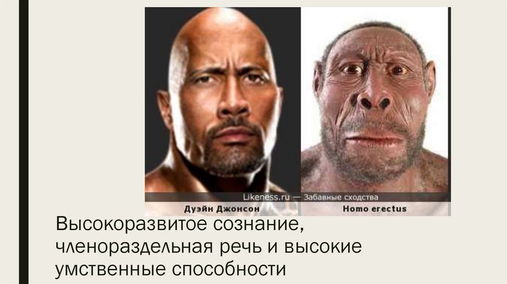 Высокоразвитое сознание,членораздельная речь и высокие