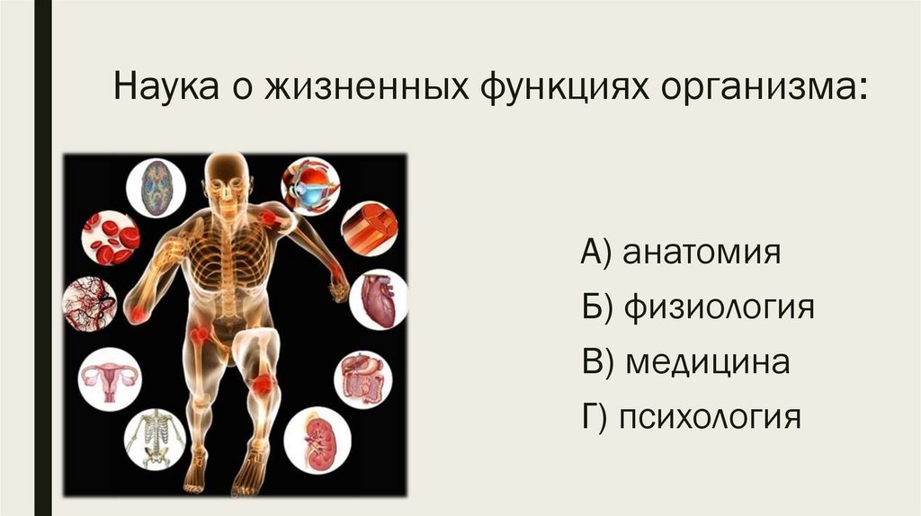Наука о жизненных функциях организма:А) анатомия