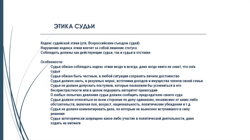 ЭТИКА СУДЬИКодекс судейской этики (утв. Всероссийским съездом судей)