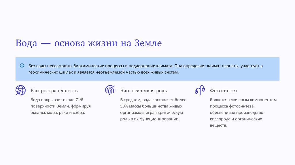 Вода — основа жизни на ЗемлеБез воды невозможны биохимические процессы и поддержание климата. Она определяет климат планеты, участвует в