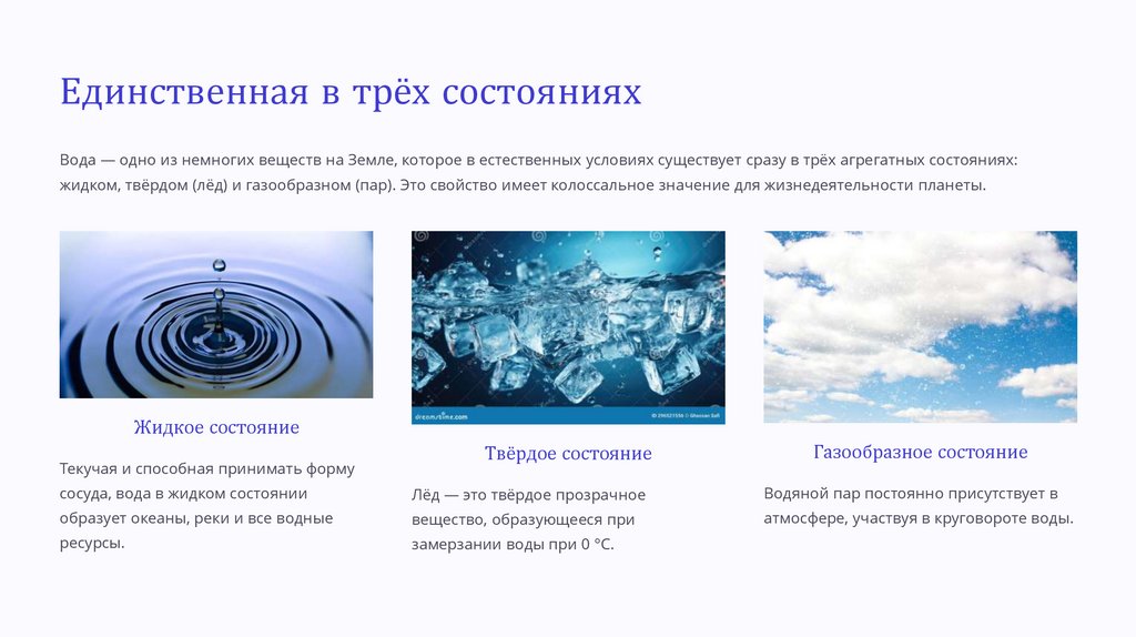жидком, твёрдом (лёд) и газообразном (пар). Это свойство имеет колоссальное значение для жизнедеятельности планеты.