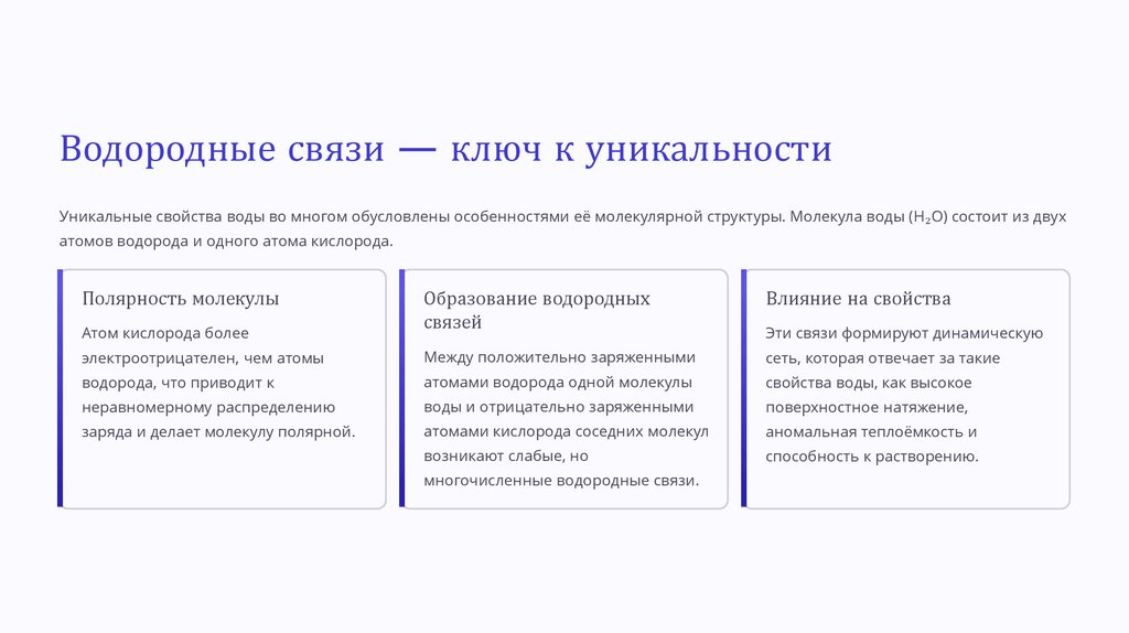 Водородные связи — ключ к уникальностиУникальные свойства воды во многом обусловлены особенностями её молекулярной структуры. Молекула воды (H₂O) состоит из двух