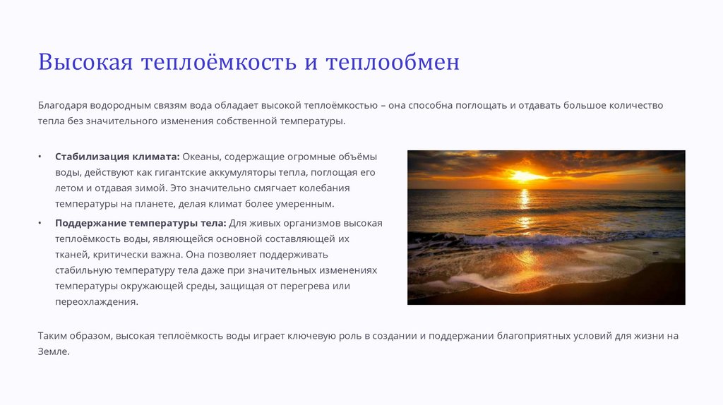 Таким образом, высокая теплоёмкость воды играет ключевую роль в создании и поддержании благоприятных условий для жизни на