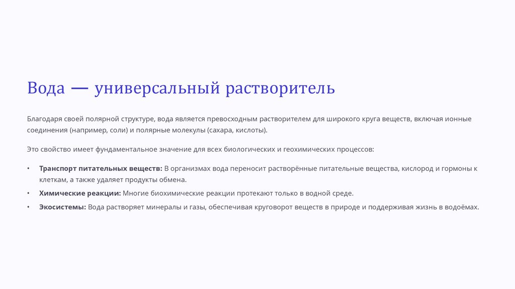 Вода — универсальный растворительБлагодаря своей полярной структуре, вода является превосходным растворителем для широкого круга веществ, включая ионные