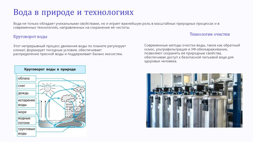 Вода в природе и технологияхВода не только обладает уникальными свойствами, но и играет важнейшую роль в масштабных природных процессах и в