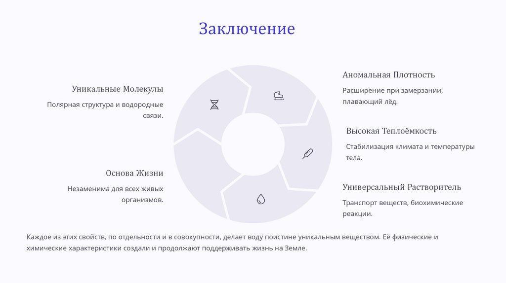 Каждое из этих свойств, по отдельности и в совокупности, делает воду поистине уникальным веществом. Её физические и