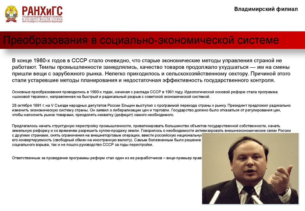 Ответственным за проведение программы реформ стал один из ее разработчиков – вице-премьер правительства РСФСР Е. Т. Гайдар.