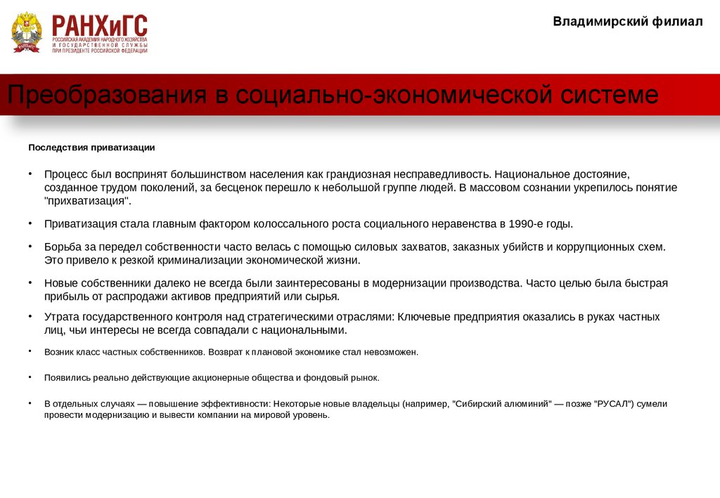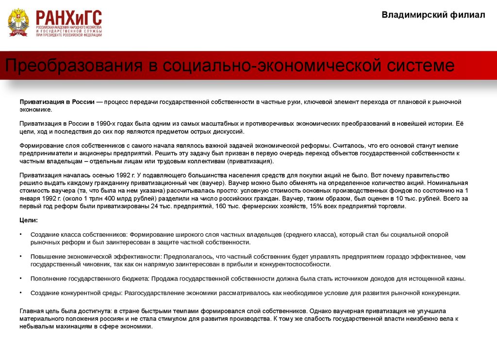 Приватизация в России — процесс передачи государственной собственности в частные руки, ключевой элемент перехода от плановой к рыночной