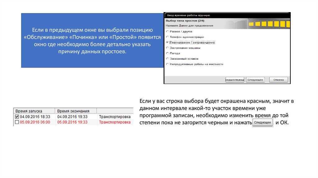 Если в предыдущем окне вы выбрали позицию«Обслуживание» «Починка» или «Простой» появится