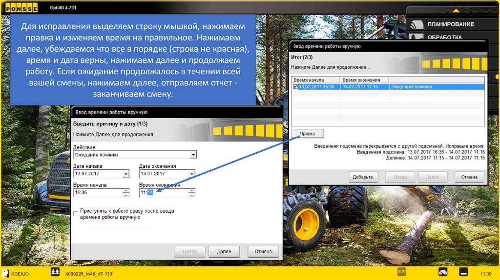 Для исправления выделяем строку мышкой, нажимаемправка и изменяем время на правильное. Нажимаем