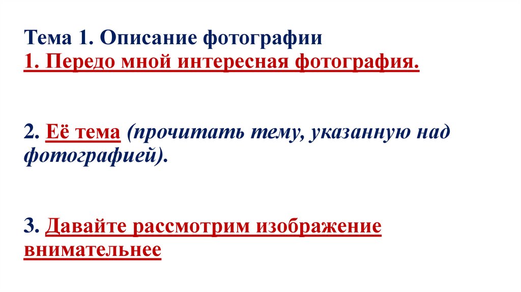 1. Тема 1. Описание фотографии 1. Передо мной интересная фотография. 2. Её тема (прочитать тему, указанную над фотографией). 3.