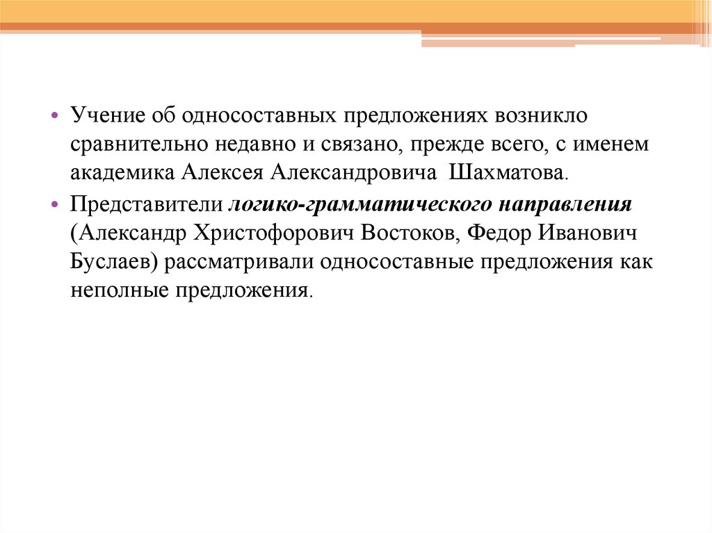 • Учение об односоставных предложениях возниклосравнительно недавно и связано, прежде всего, с именем