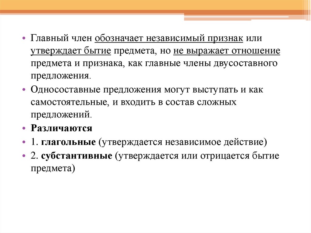 • Главный член обозначает независимый признак илиутверждает бытие предмета, но не выражает отношение
