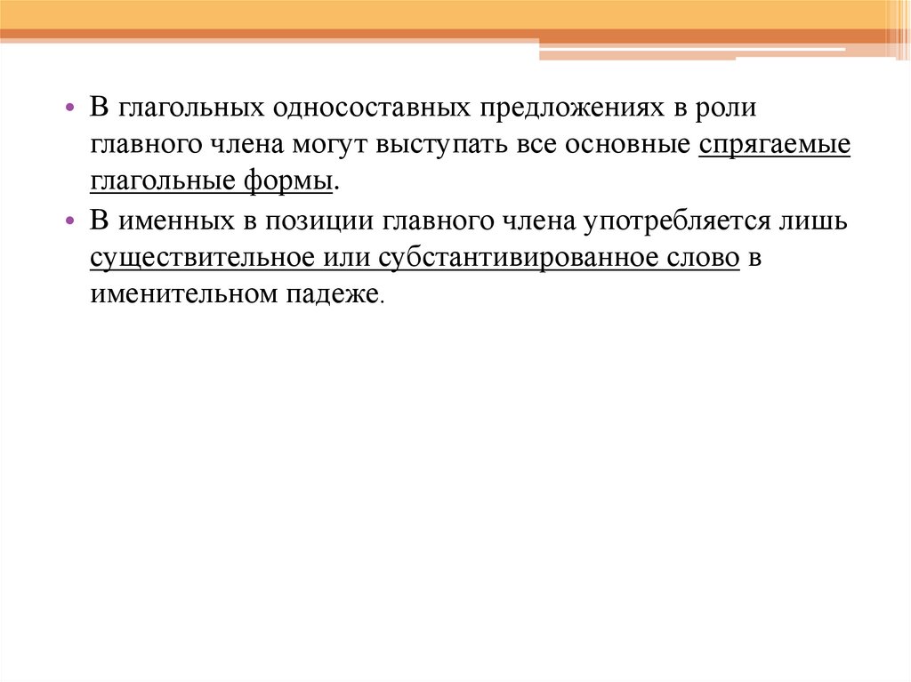 • В глагольных односоставных предложениях в ролиглавного члена могут выступать все основные спрягаемые