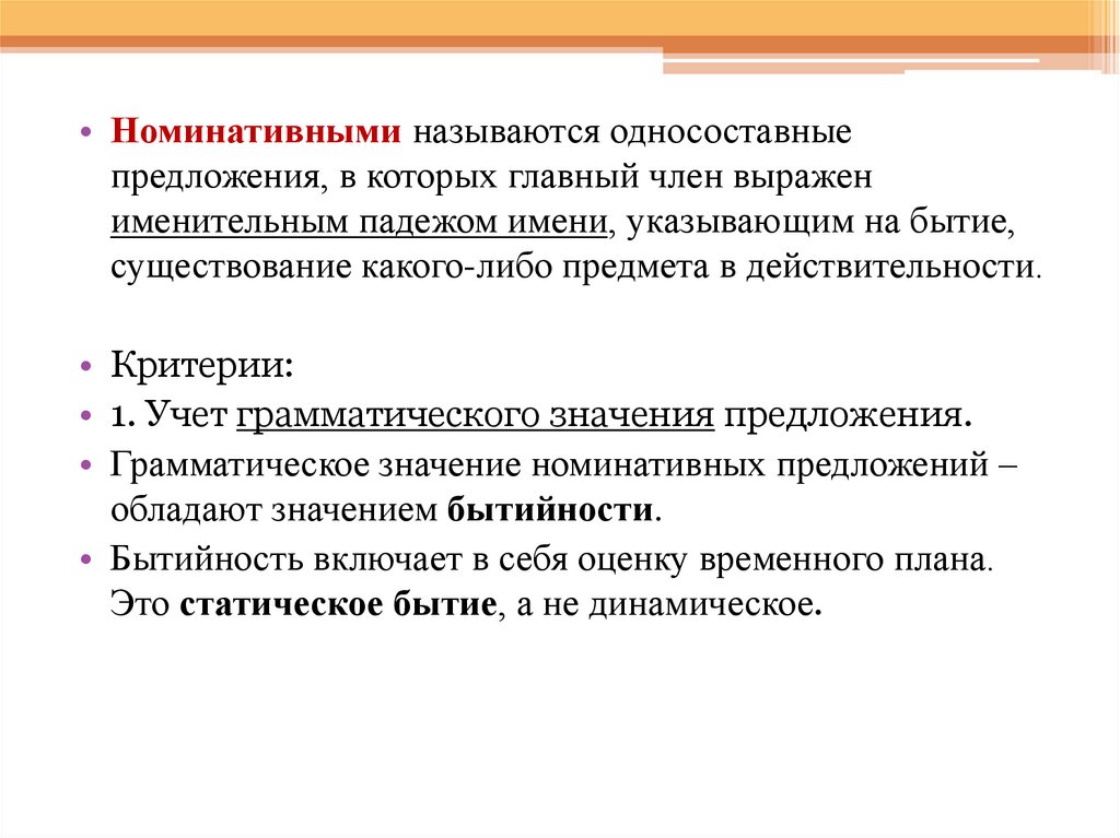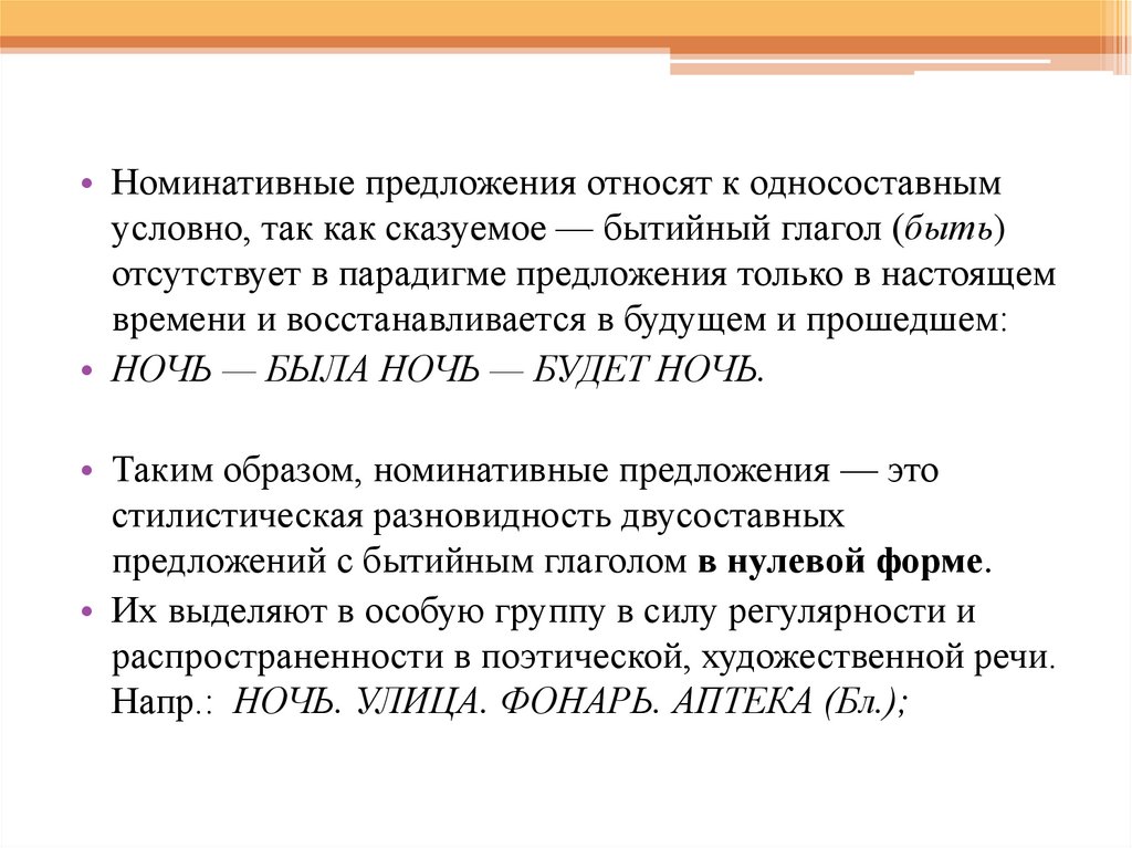 • Номинативные предложения относят к односоставнымусловно, так как сказуемое — бытийный глагол (быть)