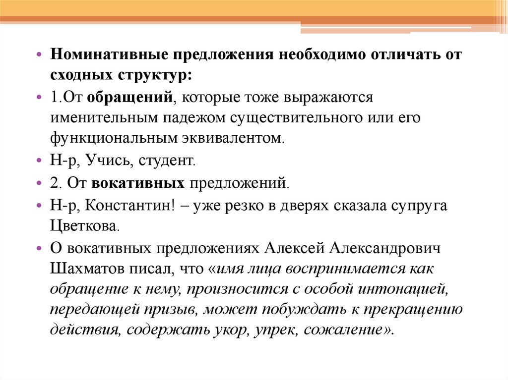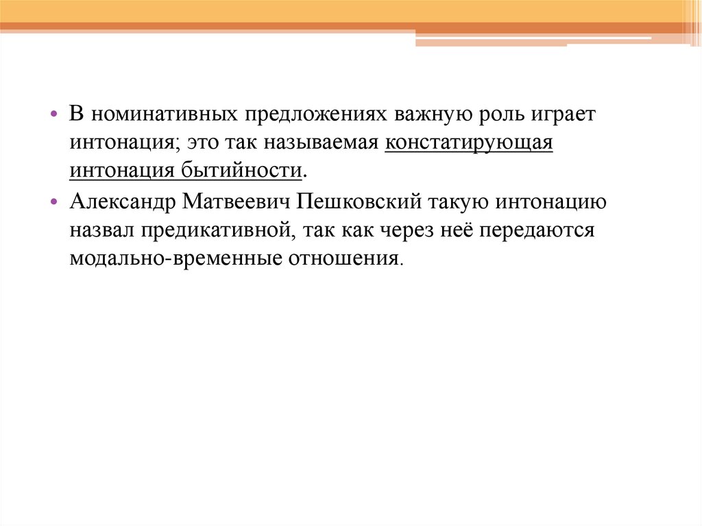 • В номинативных предложениях важную роль играетинтонация; это так называемая констатирующая