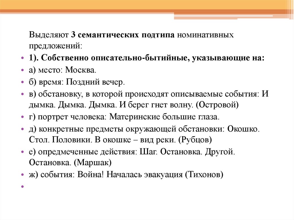 Выделяют 3 семантических подтипа номинативныхпредложений:
