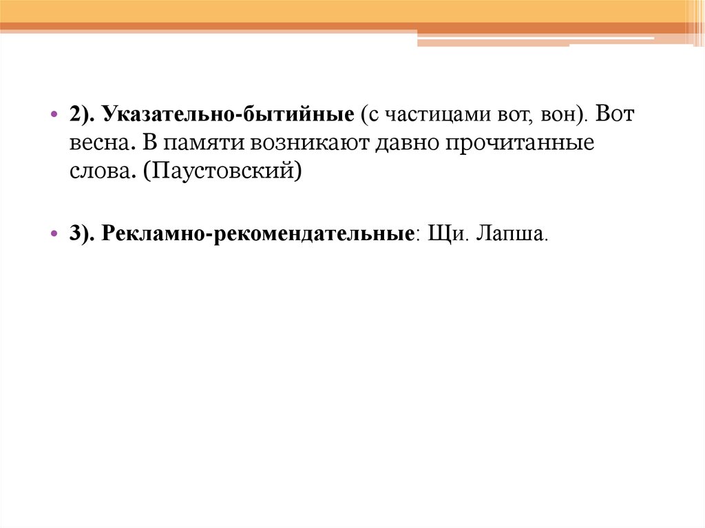 • В основном это предложения побудительнопожелательные (напр.: Воды! Врача!) или