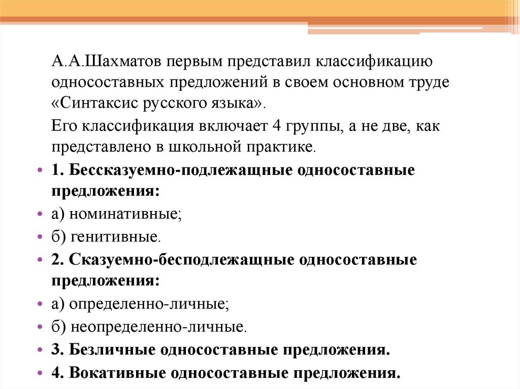 А.А.Шахматов первым представил классификациюодносоставных предложений в своем основном труде