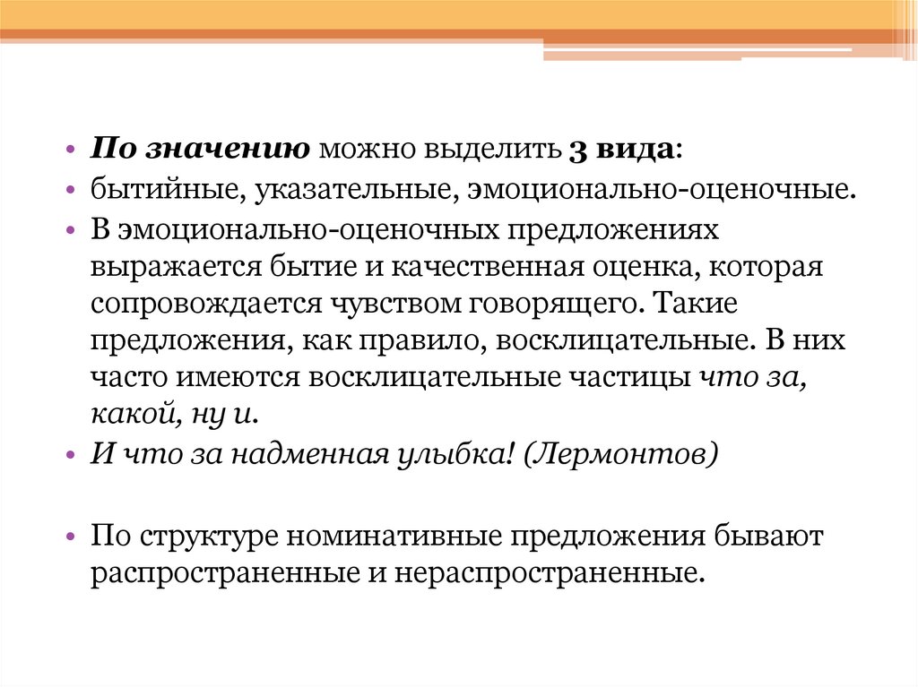 • По значению можно выделить 3 вида:• бытийные, указательные, эмоционально-оценочные.