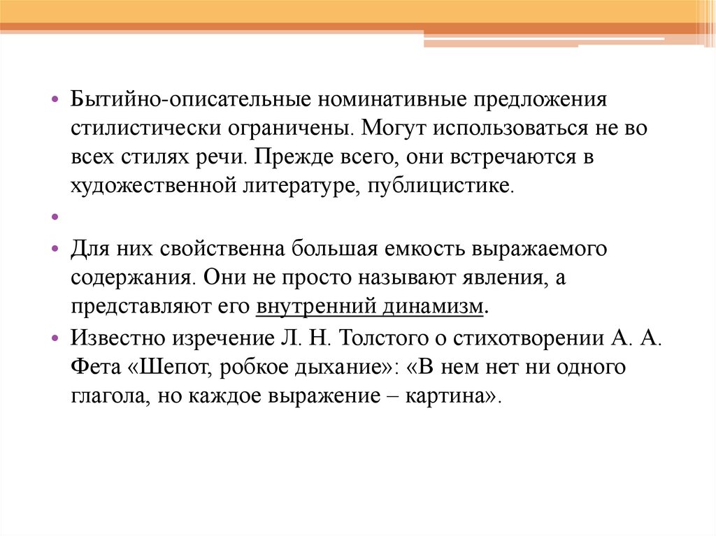 • Бытийно-описательные номинативные предложениястилистически ограничены. Могут использоваться не во