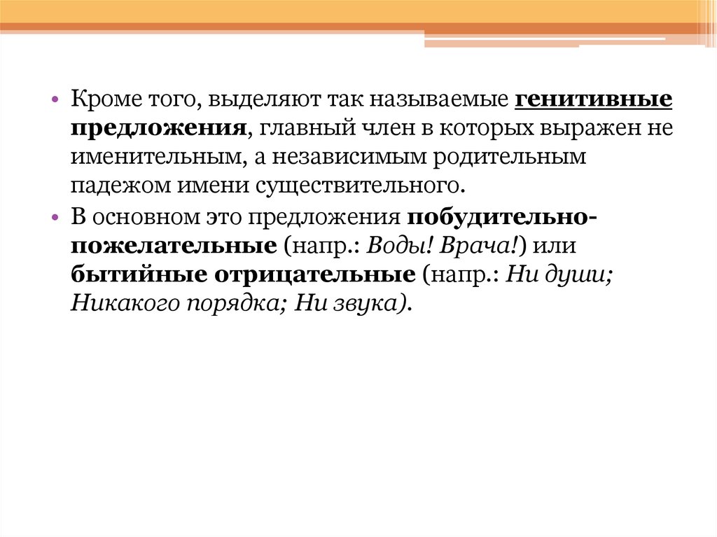 • Кроме того, выделяют так называемые генитивныепредложения, главный член в которых выражен не