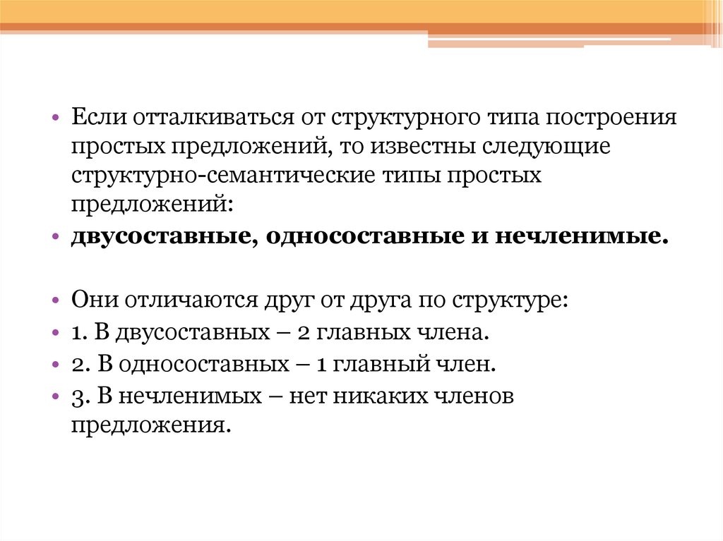 • Если отталкиваться от структурного типа построенияпростых предложений, то известны следующие