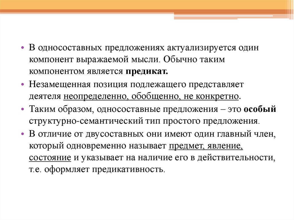 • В односоставных предложениях актуализируется одинкомпонент выражаемой мысли. Обычно таким
