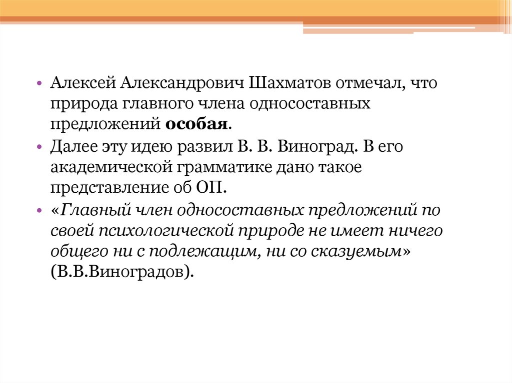 • Алексей Александрович Шахматов отмечал, чтоприрода главного члена односоставных