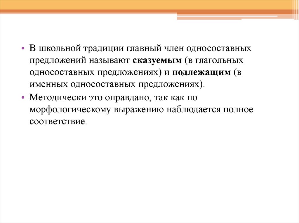 • В школьной традиции главный член односоставныхпредложений называют сказуемым (в глагольных