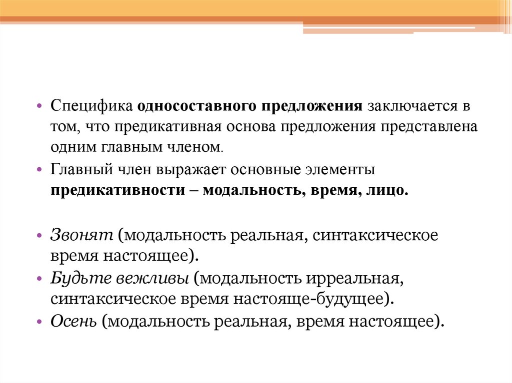 • Специфика односоставного предложения заключается втом, что предикативная основа предложения представлена