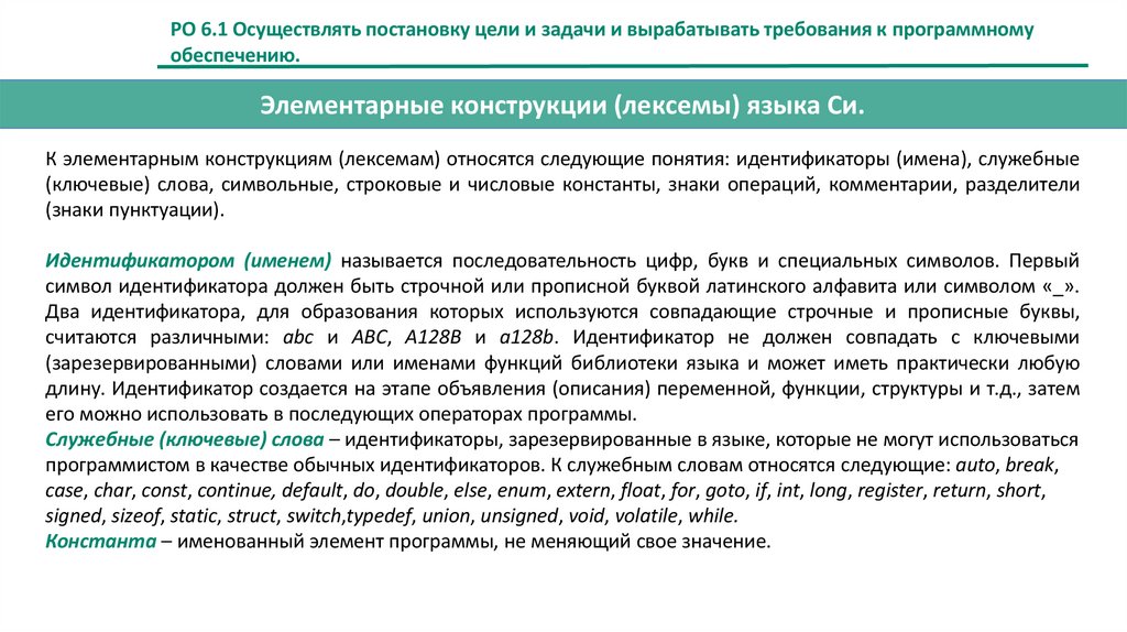 К элементарным конструкциям (лексемам) относятся следующие понятия: идентификаторы (имена), служебные