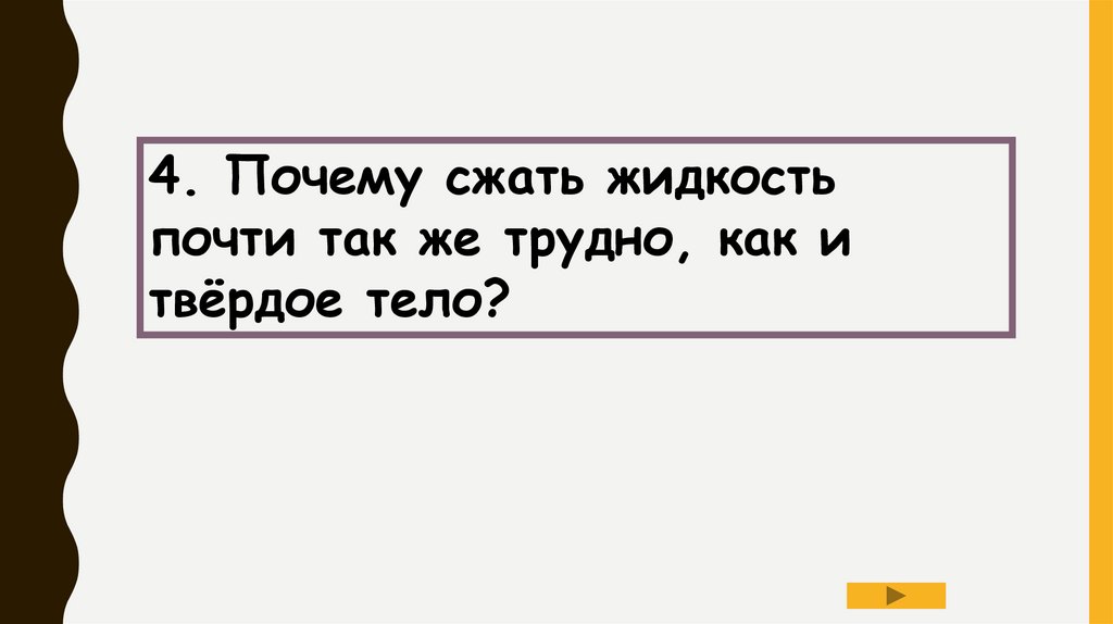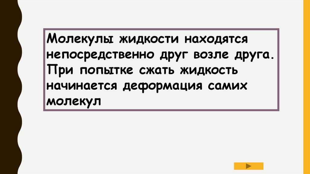 Молекулы жидкости находятся непосредственно друг возледруга. При попытке сжать жидкость начинается деформация