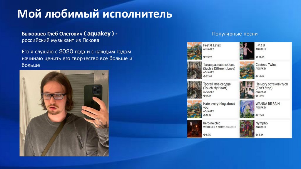 Мой любимый исполнительБыховцев Глеб Олегович ( aquakey ) российский музыкант из Пскова
