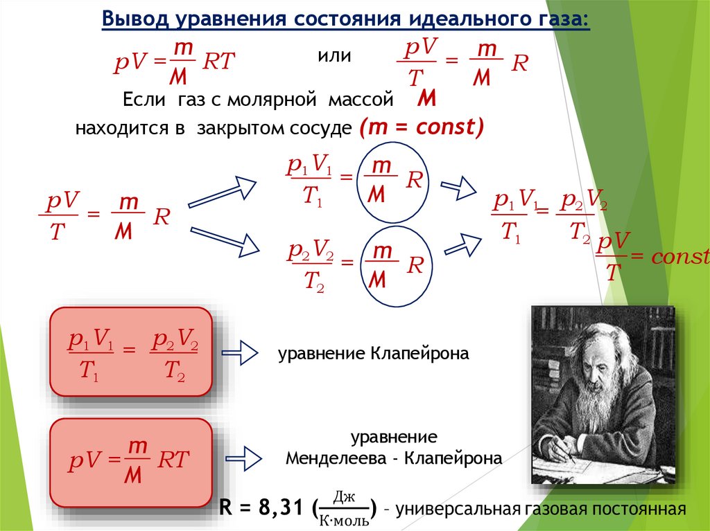 Уравнение состояния идеального газа определяетсвязь температуры, объема и давления тел:
