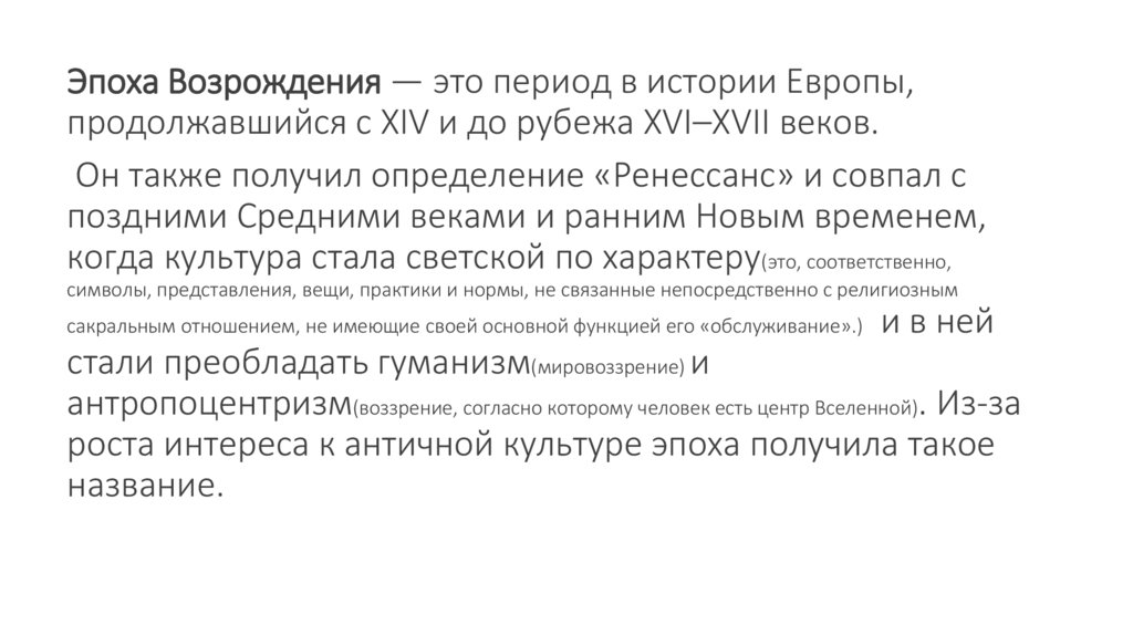 Эпоха Возрождения — это период в истории Европы,продолжавшийся с XIV и до рубежа XVI–XVII веков.