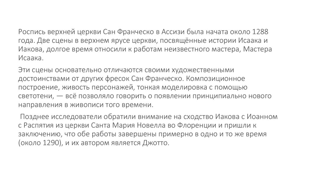 Роспись верхней церкви Сан Франческо в Ассизи была начата около 1288года. Две сцены в верхнем ярусе церкви, посвящённые истории Исаака и