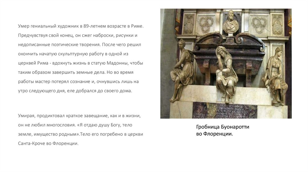 Умер гениальный художник в 89-летнем возрасте в Риме.Предчувствуя свой конец, он сжег наброски, рисунки и