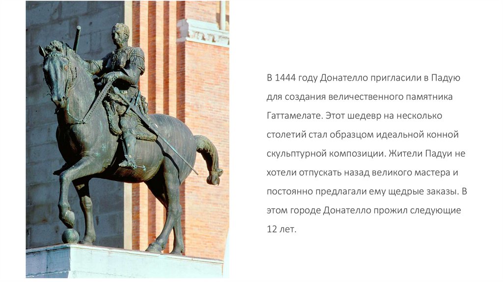 В 1444 году Донателло пригласили в Падуюдля создания величественного памятника