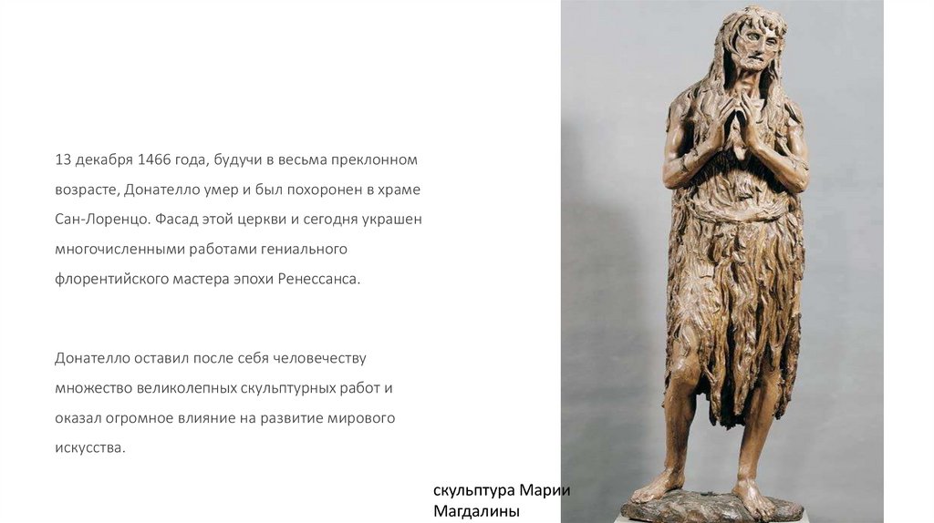 13 декабря 1466 года, будучи в весьма преклонномвозрасте, Донателло умер и был похоронен в храме