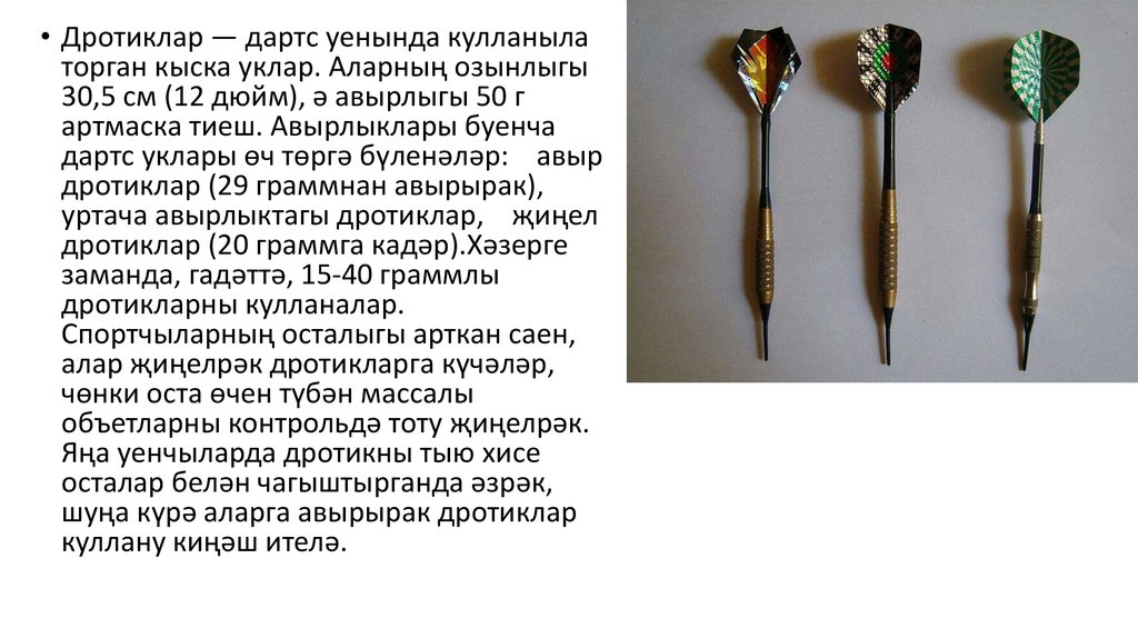 • Дротиклар — дартс уенында кулланылаторган кыска уклар. Аларның озынлыгы