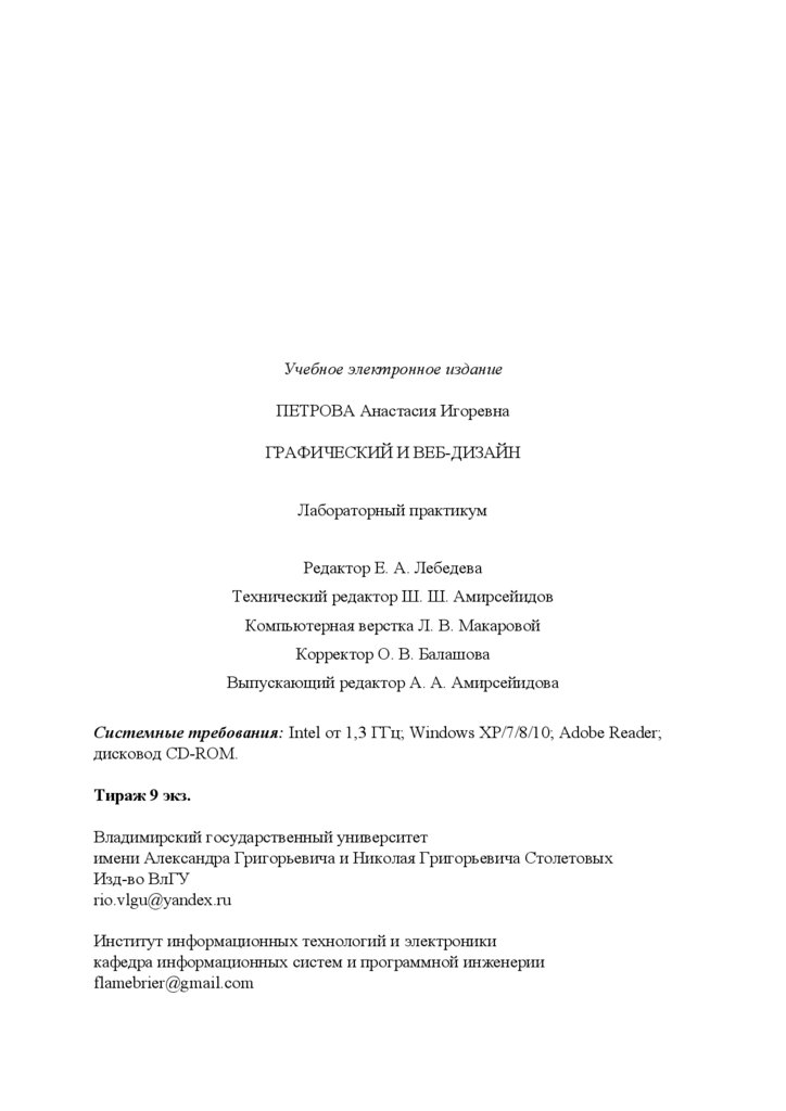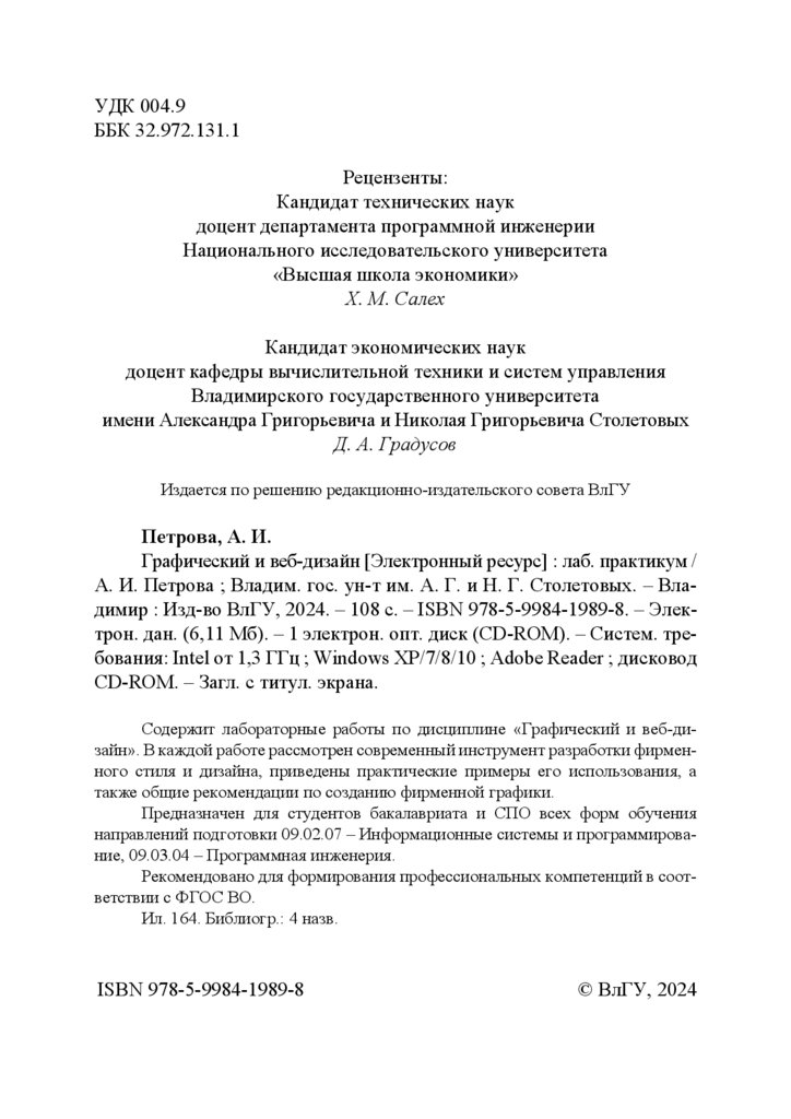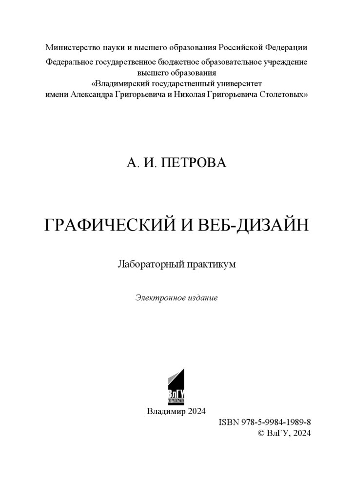 А. И. Петрова ; Владим. гос. ун-т им. А. Г. и Н. Г. Столетовых. ‒ Владимир : Изд-во ВлГУ, 2024. ‒ 108 с. ‒ ISBN 978-5-9984-1989-8. – Электрон. дан. (6,11 Мб). – 1 электрон. опт. диск (СD-ROM). – Систем. требования: Intel от 1,3 ГГц ; Windows XP/7/8/10 ; Adobe Reader ; дисковод