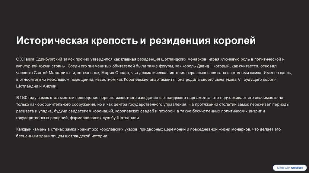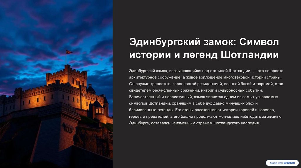 Эдинбургский замок продолжает стоять на страже, величественный и непоколебимый, приглашая каждого, кто ступит на его древние камни, окунуться в захватывающее путешествие по