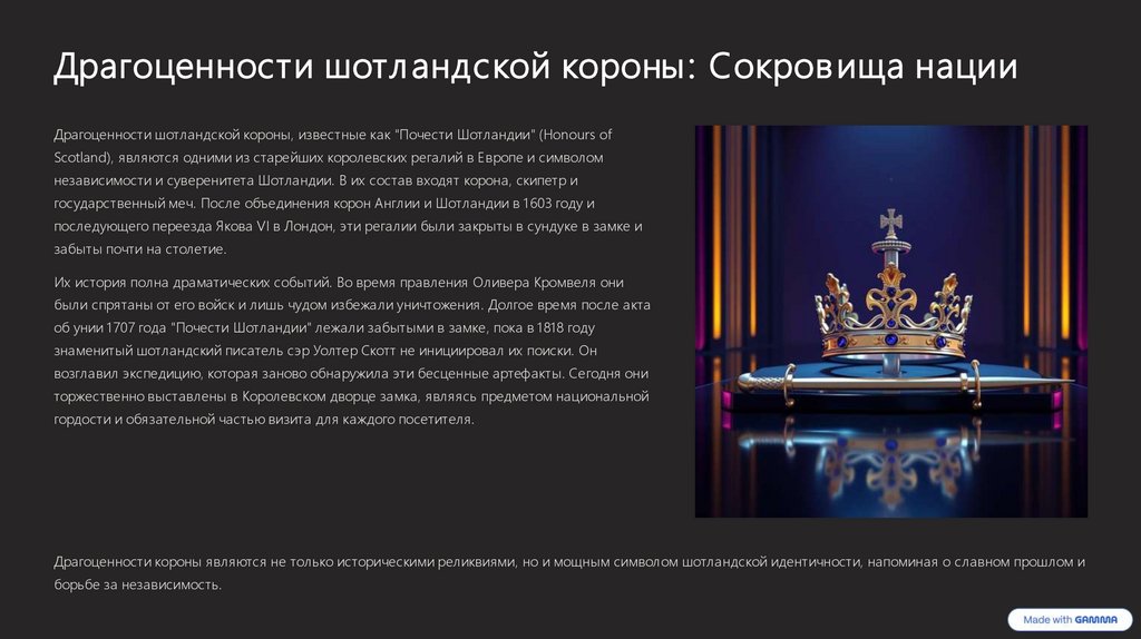 Драгоценности короны являются не только историческими реликвиями, но и мощным символом шотландской идентичности, напоминая о славном прошлом и