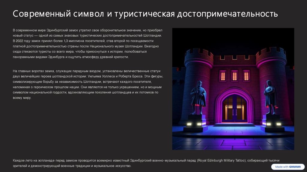 Сов ременный символ и т уристическая достопримечательностьВ современном мире Эдинбургский замок утратил свое оборонительное значение, но приобрел